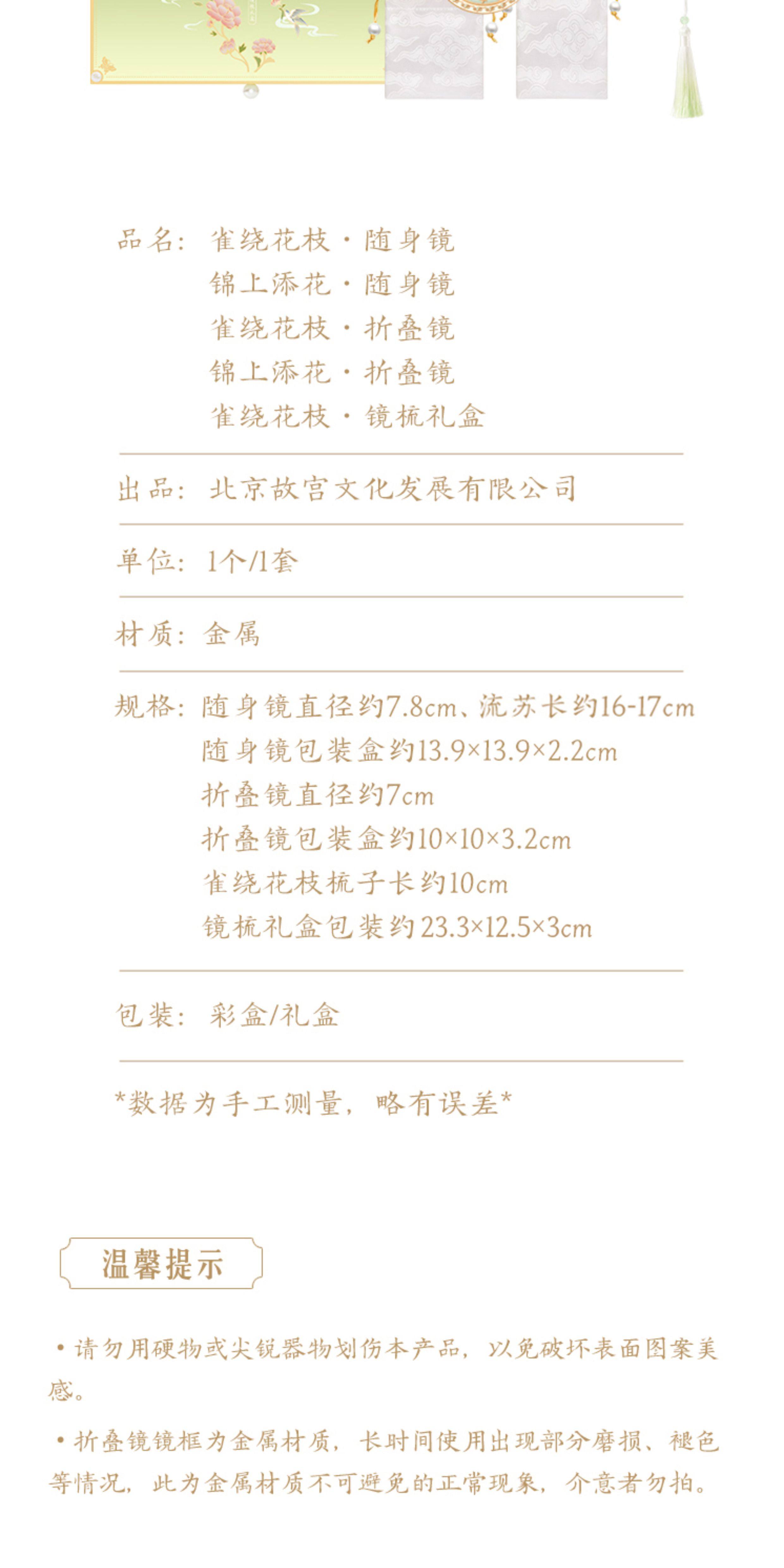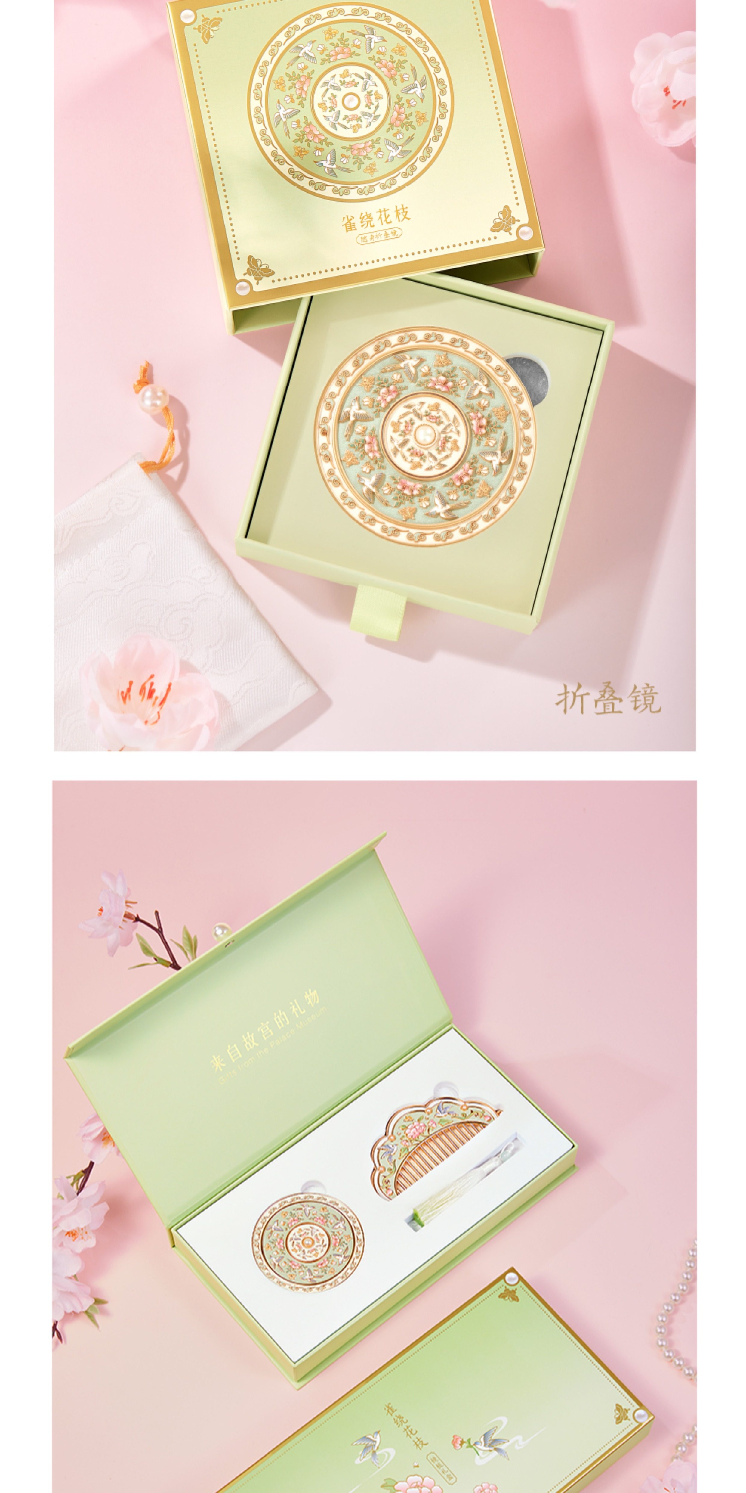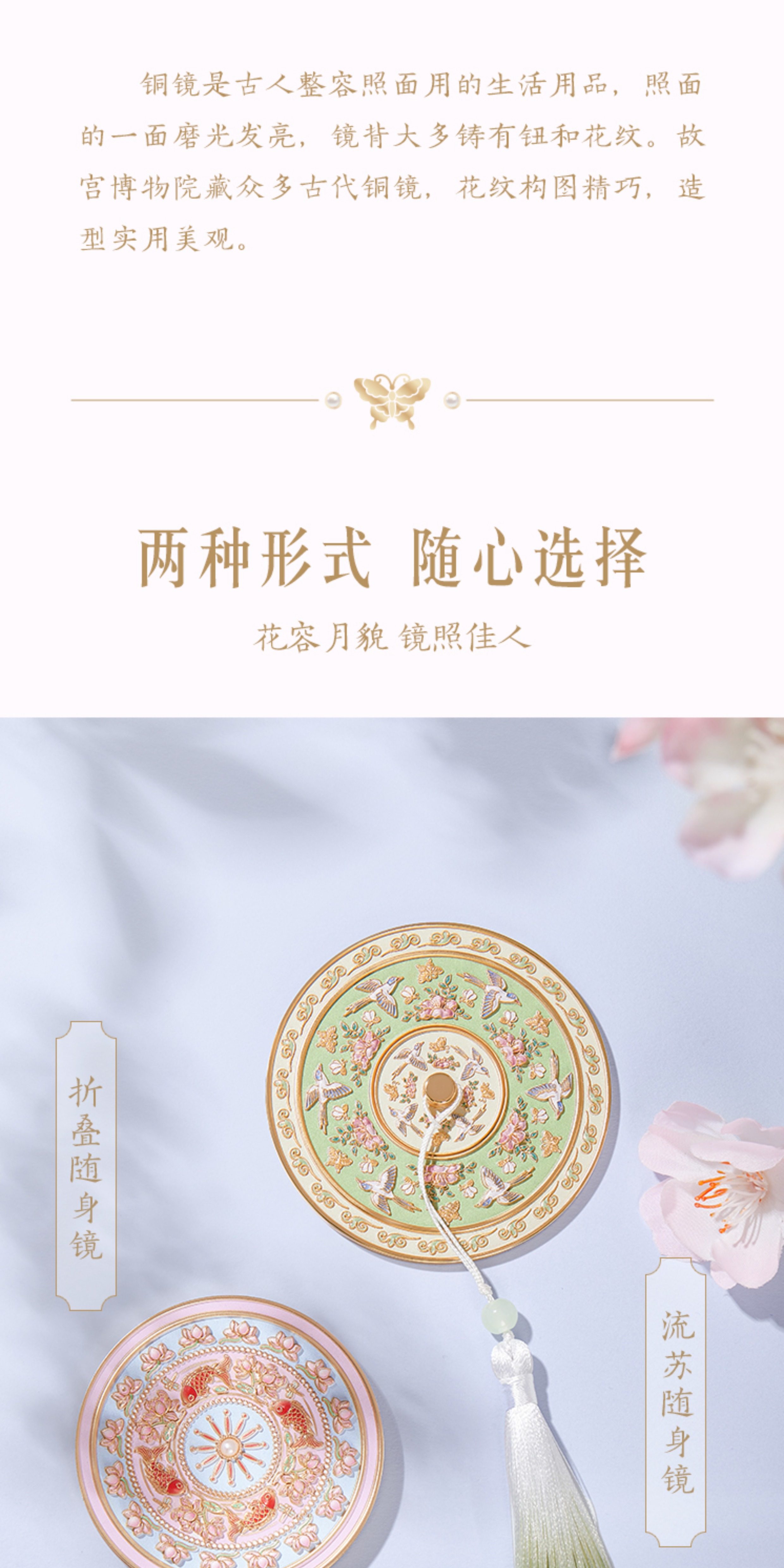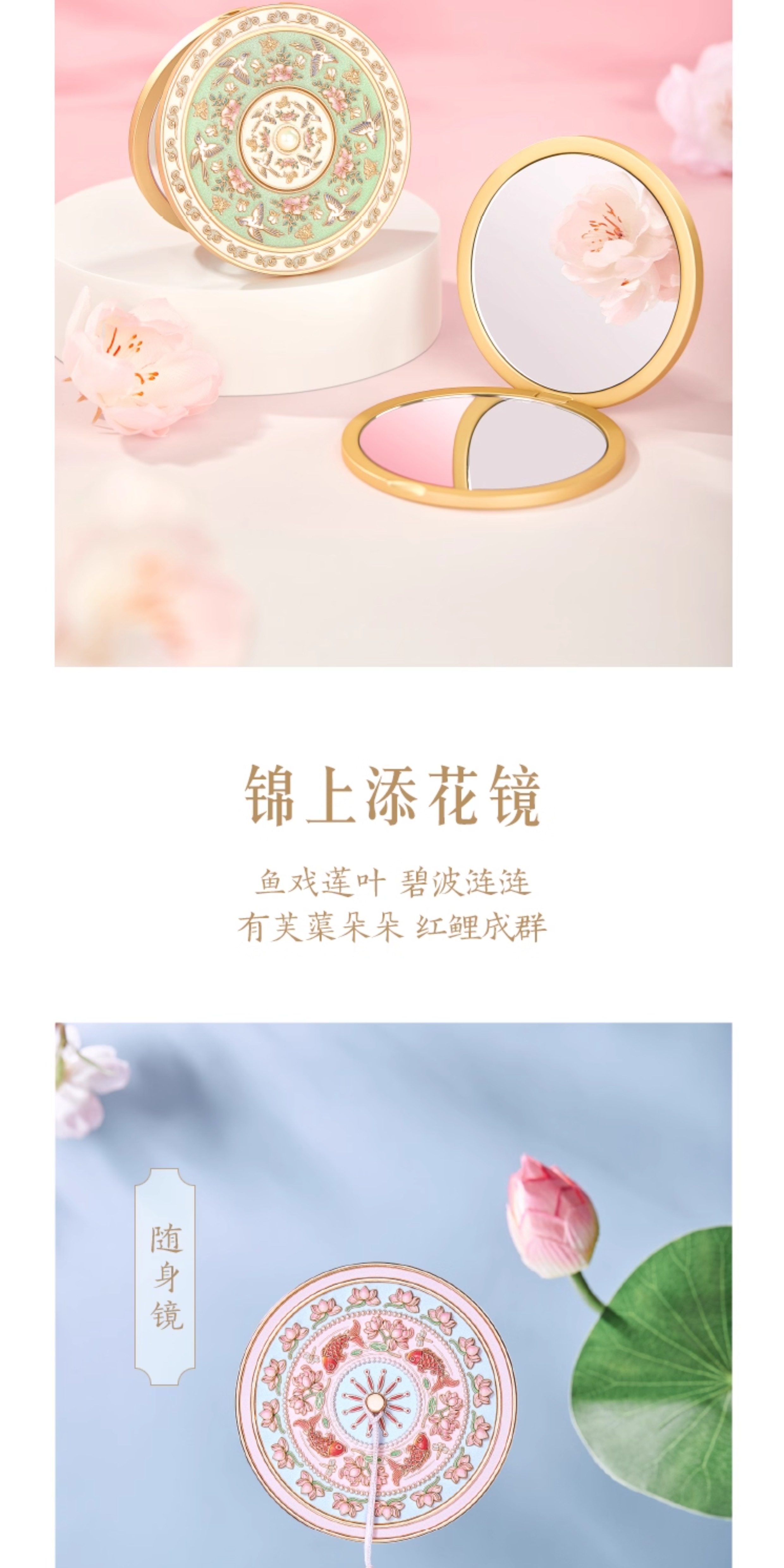 | 颜色分类 | 雀绕花枝·折叠镜 或 雀绕花枝·随身镜 或 雀绕花枝·镜梳礼盒 或 锦上添花·折叠镜 或 锦上添花·随身镜 或 芙蓉天马镜 或 故宫的雪·流沙镜 或 十二花神·折叠镜 或 十二花神·随身镜 或 月中桂兔·流沙镜 或 人面桃花·手柄镜 或 人面桃花·随身镜 或 人面桃花·折叠镜 或 人面桃花·折叠镜梳 或 人面桃花·随身镜梳套装 或 出水芙蓉·随身镜 或 出水芙蓉·折叠镜 或 出水芙蓉·手柄镜 或 凤冠·随身镜 或 凤冠·手柄镜 或 珍宝蝴蝶·随身镜 或 珍宝随身镜·金昭玉粹 或 云鬓花颜·折叠镜 或 云鬓花颜·随身镜 或 珍宝折叠镜·珠光宝气 或 珍宝随身镜·珠光宝气 或 花钿翠羽·随身镜 或 故宫的雪·随身镜 或 故宫的雪·手柄镜 或 雍正的花囊·手柄镜 或 花间蝶影·手柄镜 或 喜上眉梢·手柄镜 或 玉堂富贵·手柄镜 或 御花园·手柄镜 或 凤冠霞帔·手柄镜 |