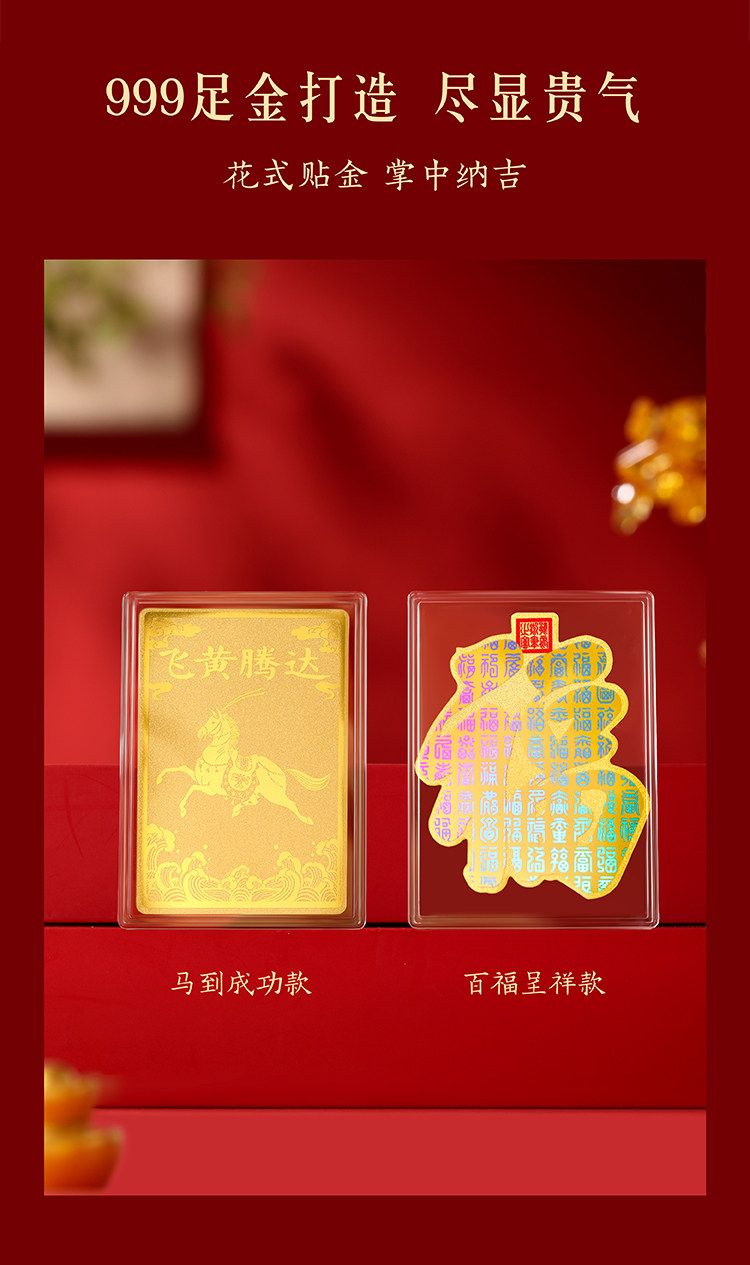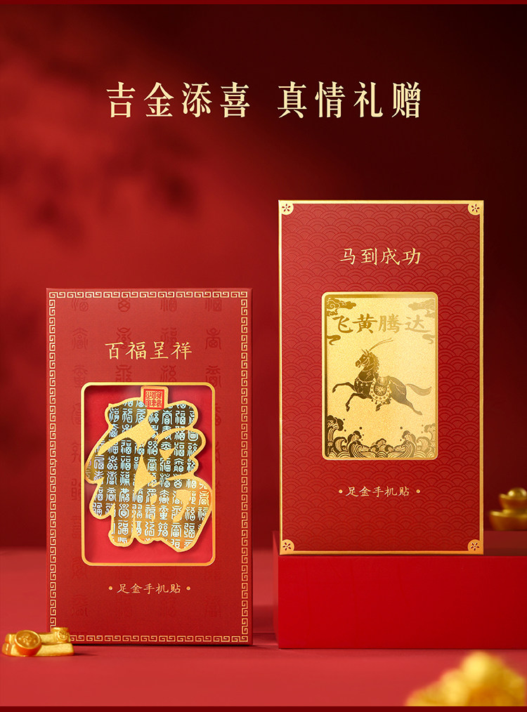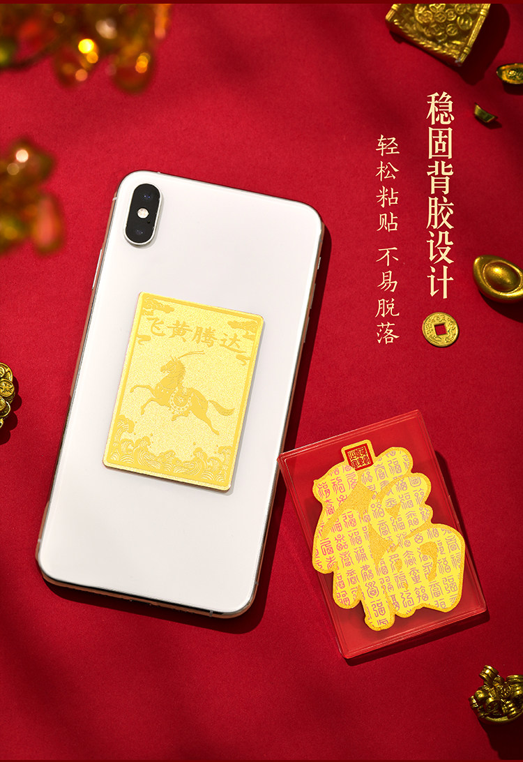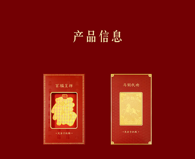 | 商品规格 | 百福呈祥·足金手机贴【含金量约3.7mg】 或 马到成功·足金手机贴【含金量约4.8mg】 |