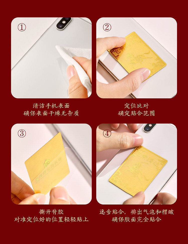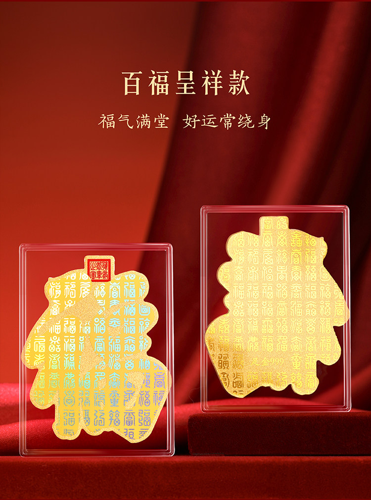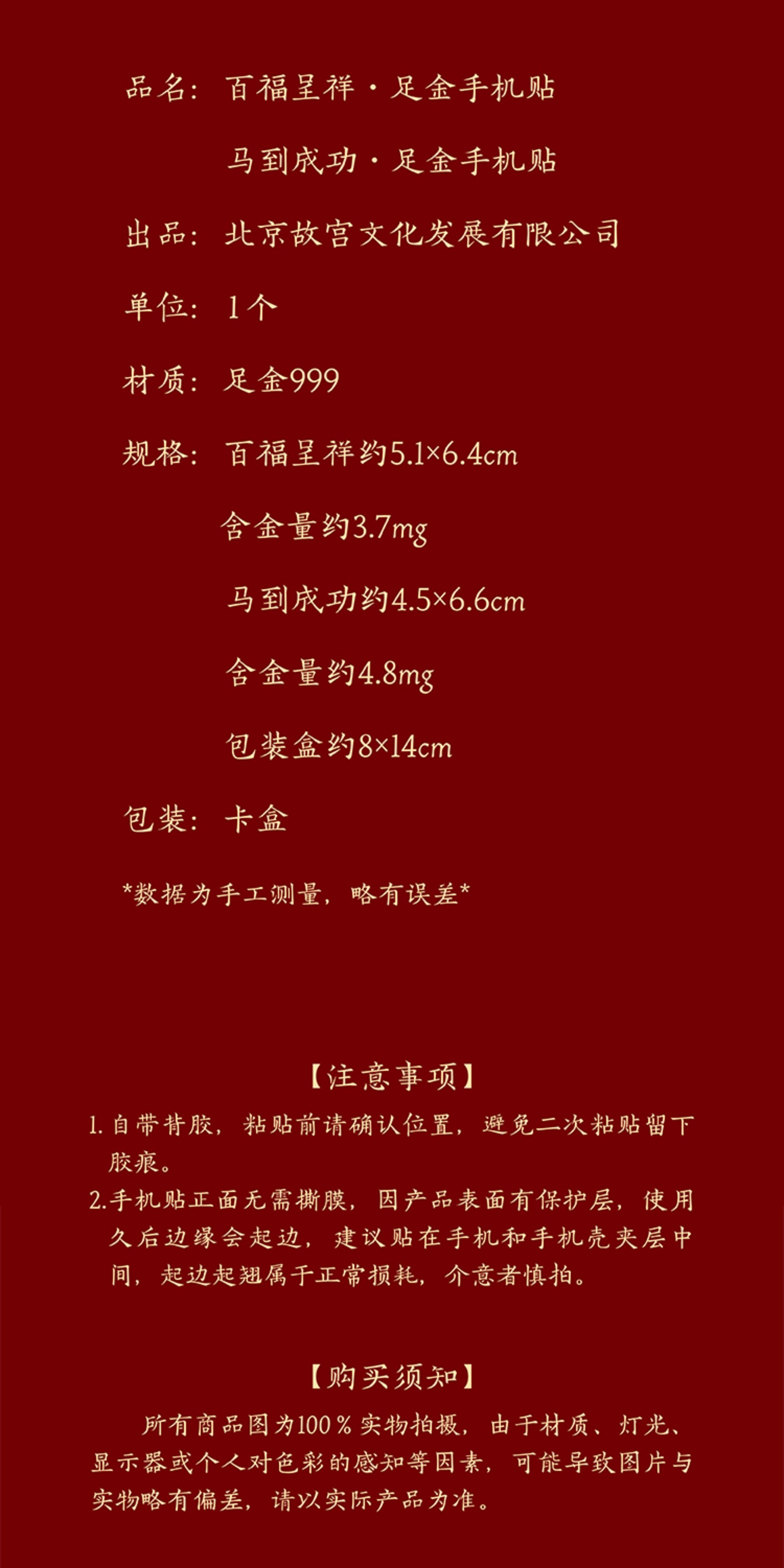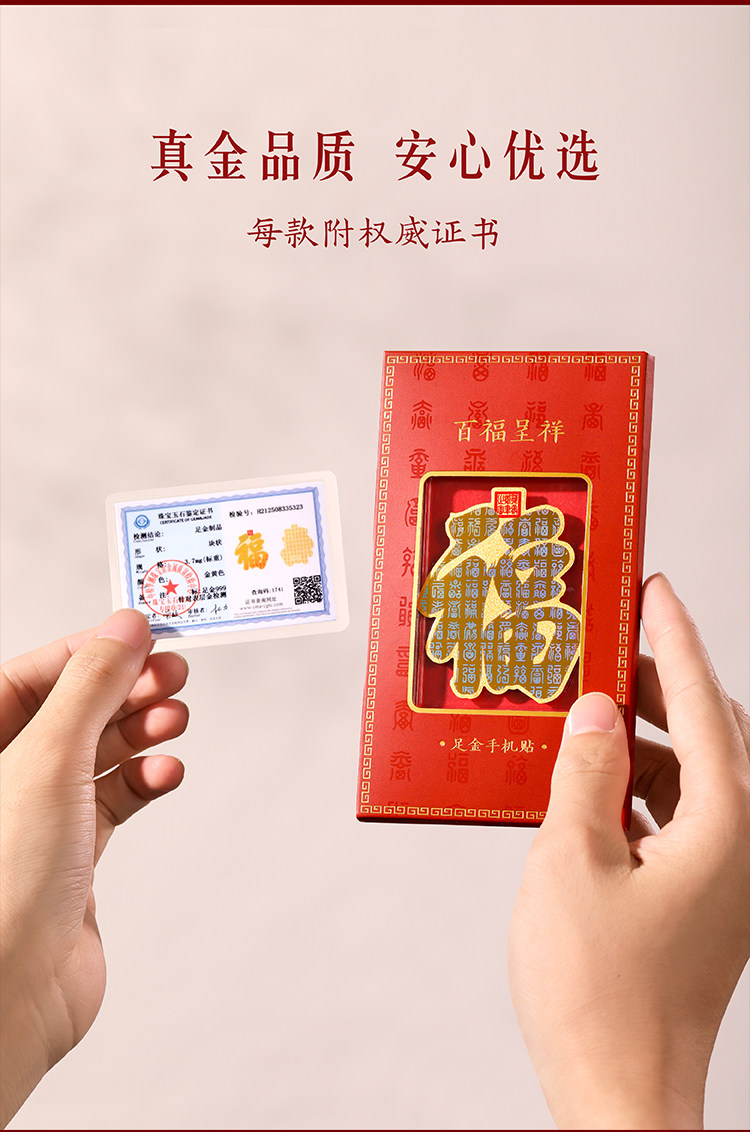 | 商品规格 | 百福呈祥·足金手机贴【含金量约3.7mg】 或 马到成功·足金手机贴【含金量约4.8mg】 |